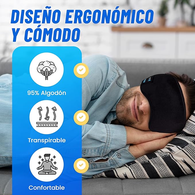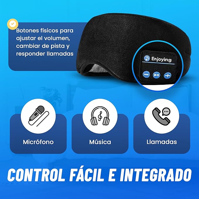 Incluye un panel de control intuitivo con botones físicos para ajustar el volumen, cambiar de pista y responder llamadas sin necesidad de tocar el teléfono. Su micrófono incorporado permite realizar llamadas con manos libres, convirtiéndolo en un accesorio multifuncional tanto para dormir como para viajes o momentos de relajación.
