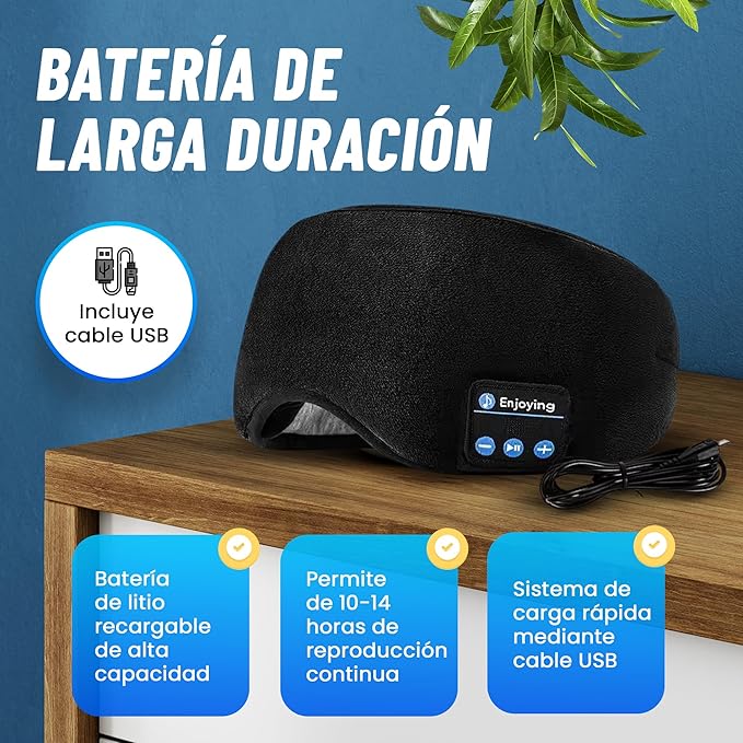 Con una batería de litio recargable de alta capacidad, el antifaz Bluetooth permite 10-14 horas de reproducción continua con una sola carga. Su sistema de carga rápida mediante cable USB asegura que esté listo para su uso en aproximadamente 2 horas, proporcionando autonomía suficiente para toda la noche.